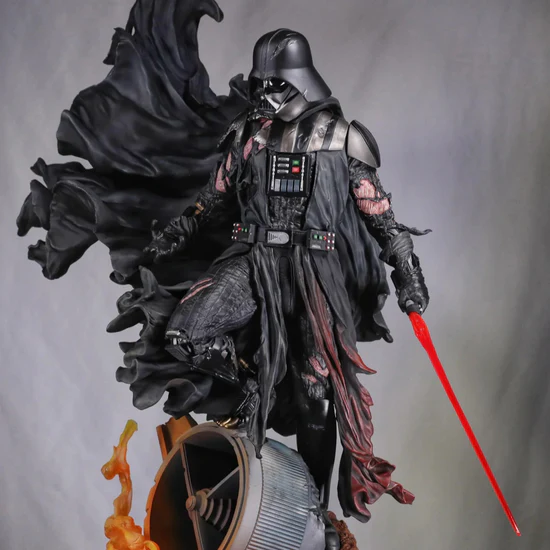 Standing an imposing 24.75″ tall and 24.4″ wide, this statue showcases Sideshow’s exceptional artistry in every detail. The fully sculpted costume reveals the intricate hardware of Vader’s cybernetic life support systems beneath tattered robes that flow dynamically as if caught in the heat of battle. Battle damage exposes mechanical limbs and burn scars from his fateful duel on Mustafar, while striking paint applications reflect the glow of flames and his crimson lightsaber across the windswept fabric. Two distinct portraits allow you to display either the iconic damaged helmet or the scarred, unmasked face of Anakin Skywalker consumed entirely by darkness.